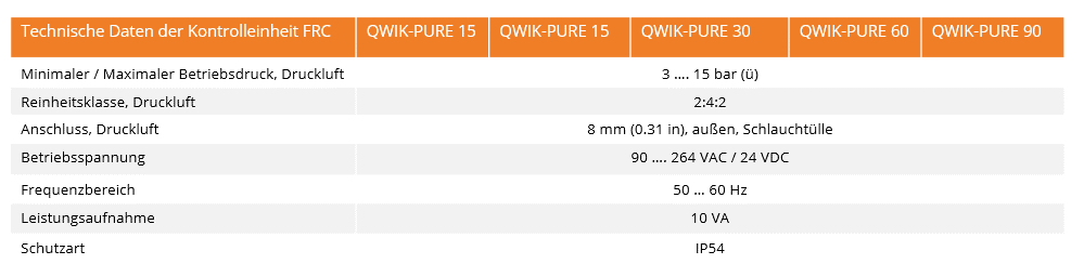Die integrierte Steuerung FRG zeigt zuverlässig die aktuelle Restkapazität der Kartusche an, überwacht das System und regelt automatisch die Kondensatabscheidung. Auch zeitweise erhöhte Kondensatmengen können so sicher entsorgt werden. Entstehen Probleme, werden selbstständig Maßnahmen eingeleitet oder ein Alarm ausgelöst. Im Störungs- oder Stromausfall arbeitet der QWIK-PURE wie ein konventioneller Schwerkrafttrenner im Fail-Safe-Modus weiter.