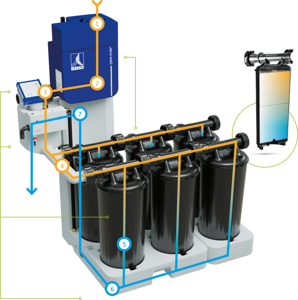 Während herkömmliche Öl-Wasser-Trenner nach dem Schwerkraftprinzip arbeiten und das Kondensat in die Filtermedien sickert, wird beim QWIK-PURE das Kondensat durch einen leichten Druckluftstrom aktiv durch den Vor- und Hauptfilter gedrückt. Die Kartusche ist permanent mit Flüssigkeit gefüllt, damit sie nicht austrocknet und eine undurchlässige Grenzschicht bildet. Problematische Kulturen, mit denen Mitarbeiter bzw. Servicepersonal in Kontakt kommen könnten, sind kaum noch vorhanden.