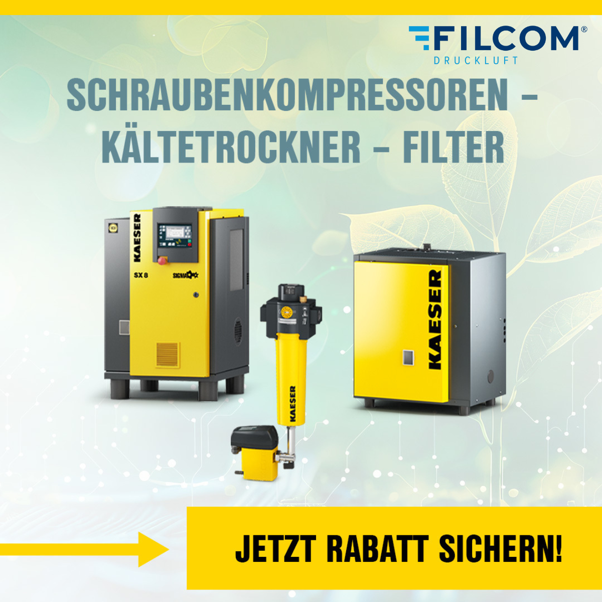 Die FILCOM GmbH ist von der Nachhaltigkeit und Leistungsfähigkeit der KAESER Schraubenkompressoren überzeugt. Deshalb gibt es für Sie einen 10 % Rabatt! Das heißt: Sie profitieren doppelt – von nachhaltigen Produkten und attraktiven Preisnachlässen.