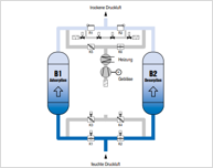 In der Premium-Serie KAESER CALOSEC CSA(-V) erfolgt die Desorption im Gegenstrom zur Adsorptionsrichtung unter Verwendung von erhitzter Umgebungsluft. Die Kühlung erfolgt hingegen durch Umgebungsluft im Gleichstrom. Dieses Verfahren führt zu keinem Druckluftverlust für die Regeneration, was als Zero Purge bezeichnet wird. Die Anwendung des Zero-Purge-Verfahrens ist vom Taupunkt der Umgebung abhängig und kann nur bis zu einem maximalen Wert eingesetzt werden. Im Unterschied zu herkömmlichen Zero-Purge-Trocknern kann die Serie KAESER CALOSEC CSA(-V) bei aktivierter AMBIENT CONTROL auch zuverlässig in Phasen mit höheren Umgebungstaupunkten verwendet werden.