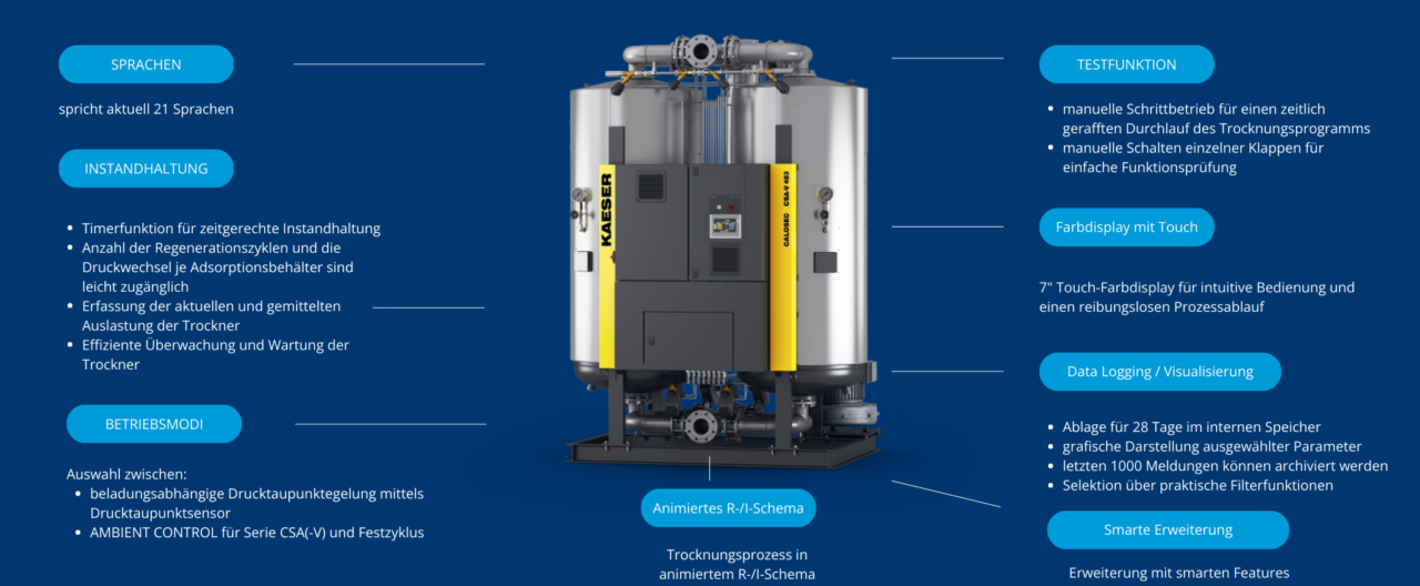 Die neu eingeführte Baureihe der warmregenerierenden Adsorptionstrockner, CALOSEC, von KAESER Kompressoren SE stellt eine zuverlässige und effiziente Lösung für die Trocknung von Druckluft dar. Durch die Integration der innovativen netzwerkfähigen Steuerung KAESER CALOSEC CONTROL wird die präzise und einfache Steuerung der Trockner optimiert. Die Kombination aus fortschrittlicher Drucktaupunktregelung und dem leistungsstarken Trocknungsmittel Silicagel Eco gewährleistet eine effektive Trocknung und Entfeuchtung der Luft.