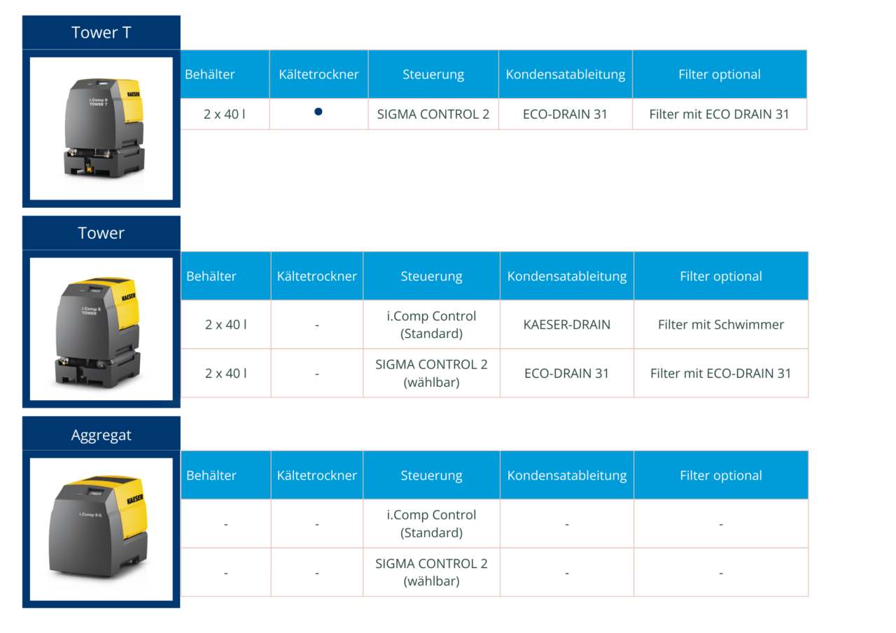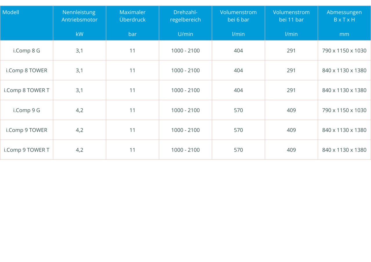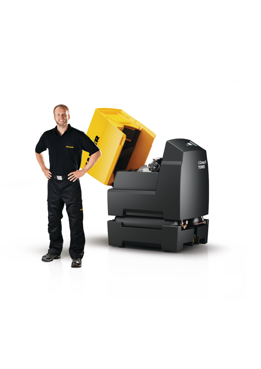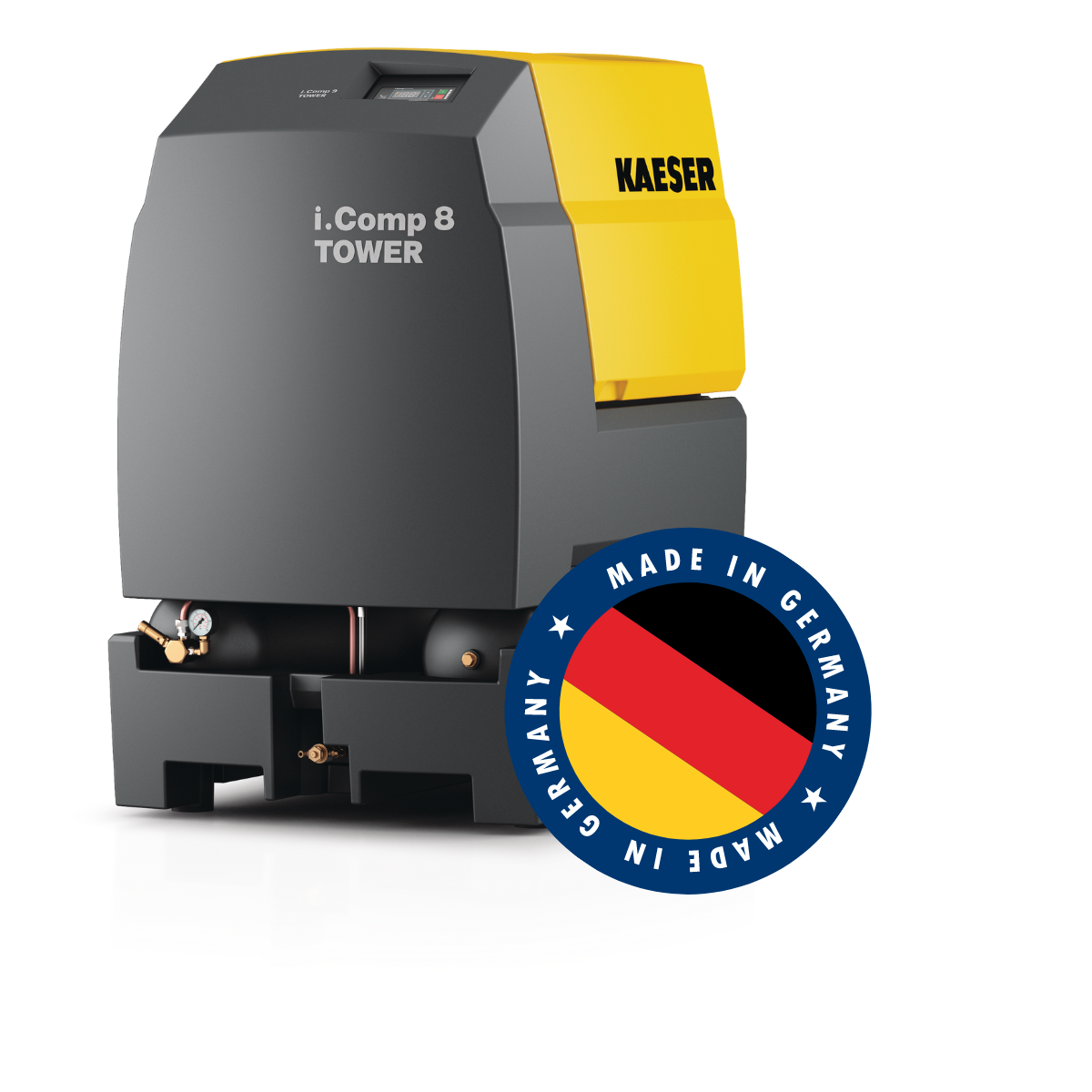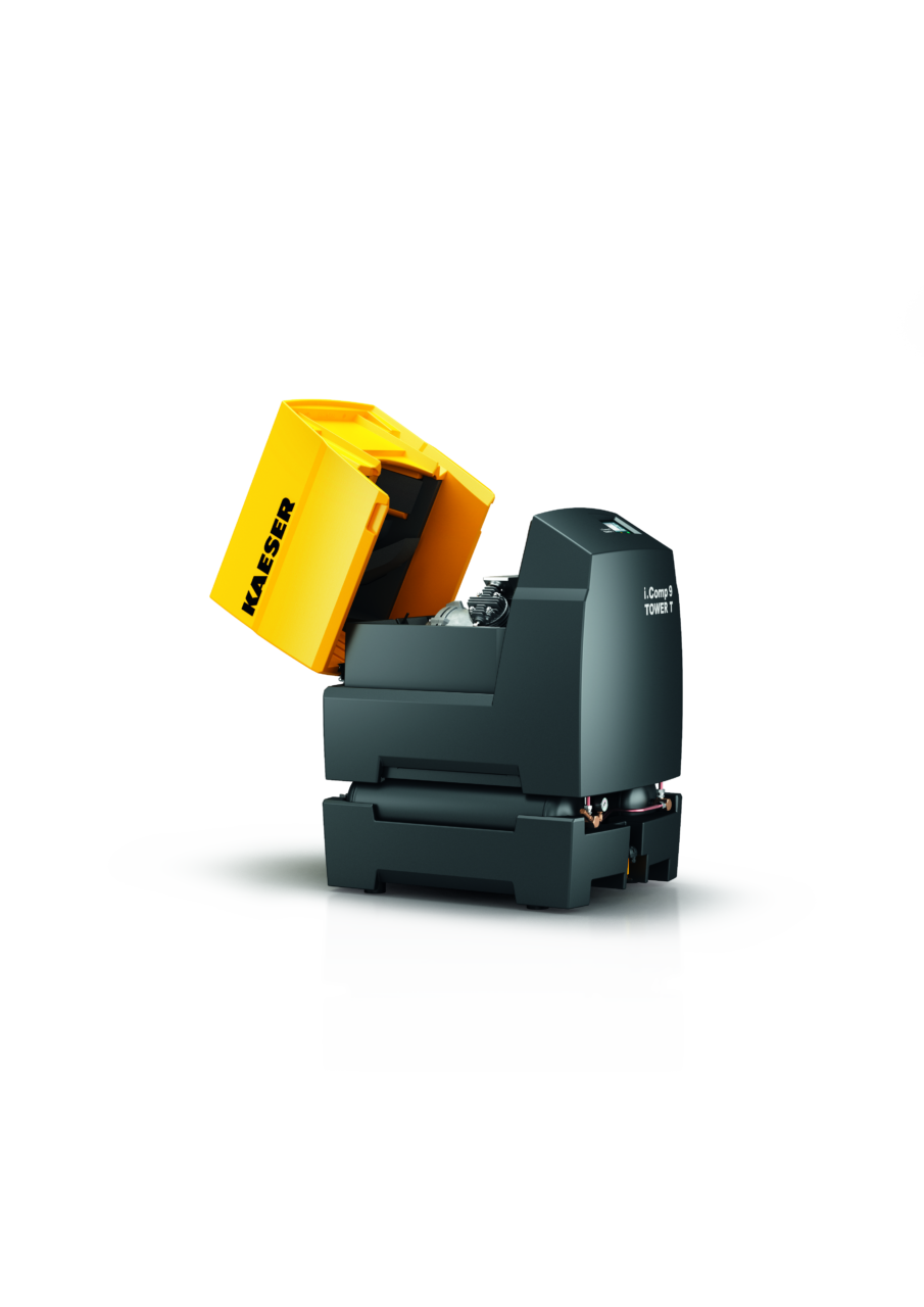 Der i.Comp 8/9 von KAESER beeindruckt mit seinem innovativen Antriebskonzept und erscheint in einem robusten, kompakten und bedarfsgerechten Design. Unter der rotationsgesinterten PE-Haube verbirgt sich ein ölfreier Kolbenkompressor mit einem drehzahlgeregelten Motor, der stets genau die benötigte Menge an Druckluft liefert. Die i.Comp TOWER T Modelle integrieren Kompressorblock, Druckluftbehälter, Kältetrockner und die SIGMA CONTROL 2 Steuerung in einem anschlussfertigen Gehäuse-Komplettsystem. Diese Konfiguration macht sie zur idealen Wahl für Handwerksbetriebe, Industrien, Werkstätten und Labore.