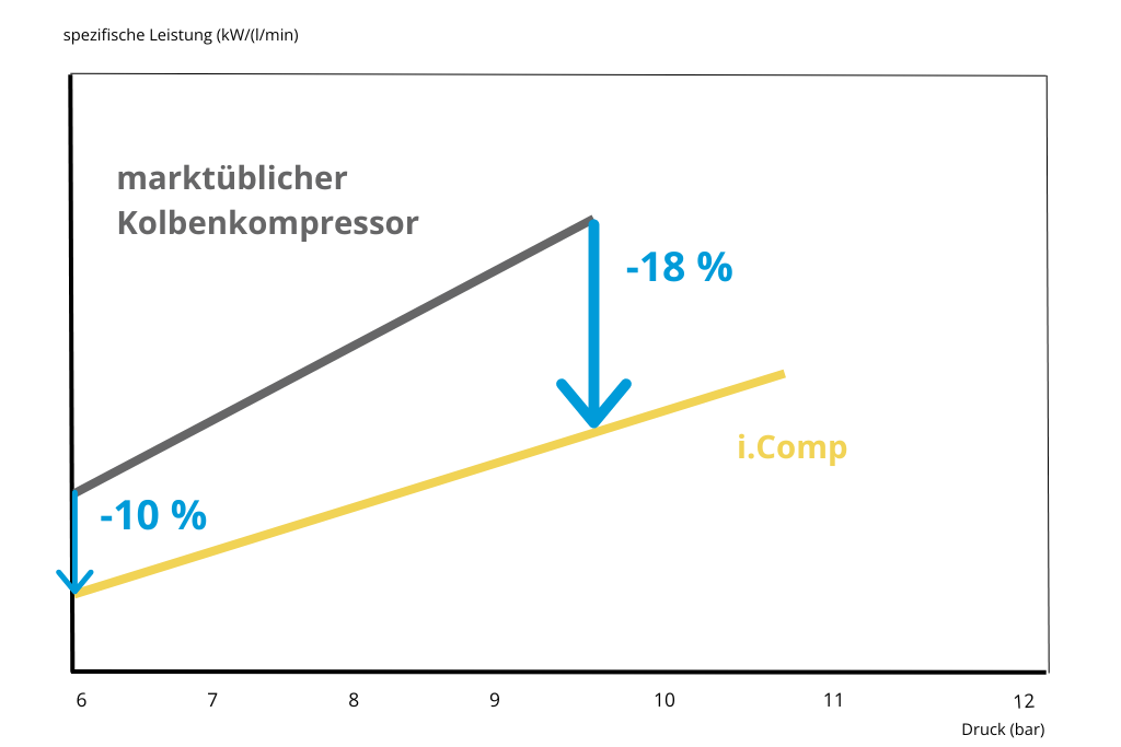 Der einstufige, ölfreie Kolbenkompressor arbeitet in allen Lastphasen äußerst effizient. Der wirtschaftliche Teillastbetrieb spart zusätzlich Energie. Weniger Schaltvorgänge entlasten die Druckleitung und minimieren Druckverluste. Dank des drehzahlgeregelten Motors wird genau die benötigte Menge an Druckluft geliefert, was den Betrieb besonders effizient macht. Der i.Comp 8/9 zeichnet sich durch eine bis zu 18 % niedrigere spezifische Leistung im Vergleich zu marktüblichen Kolbenkompressoren aus.