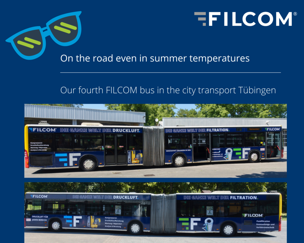 Since yesterday, our FILCOM bus has been guiding products related to compressed air and filtration on the road to success in the sweltering heat of Tübingen’s city traffic. From now on, FILCOM GmbH will also be on the road here with an articulated bus for one year.