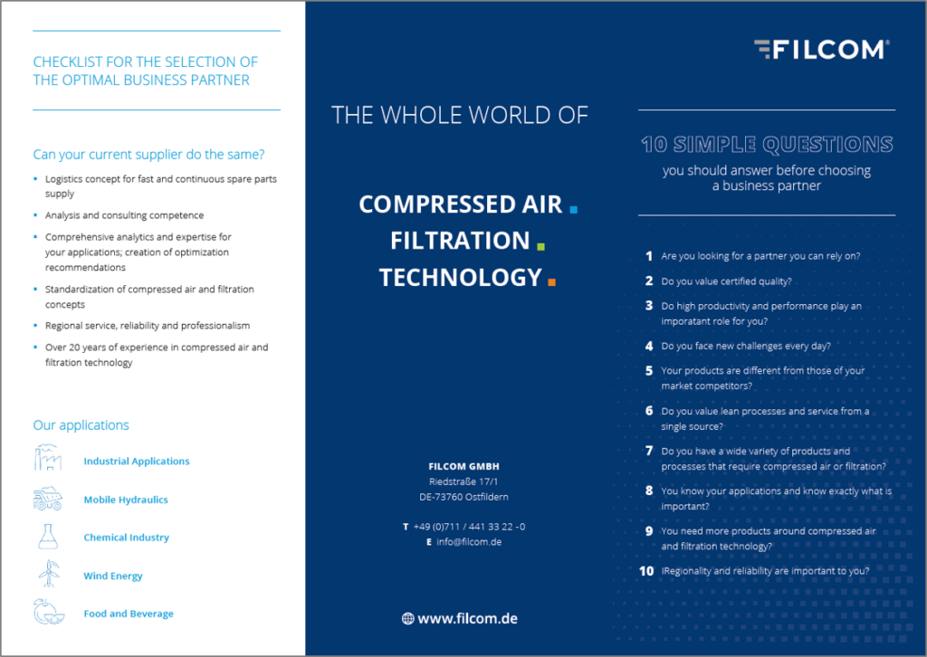 FILCOM GmbH is your competent partner for compressed air and filtration technology. This is proven by our customer base. With more than 40,000 customers worldwide in 90 countries, we maintain long-term partnerships in mutual trust and have been working together for over 21 years! As an official support dealer of KAESER Kompressoren SE as well as premium partner of Filtration Group Industrial, we are a reliable partner for compressed air and filtration technology to solve problems, optimize processes and save our customers and partners money in their production.