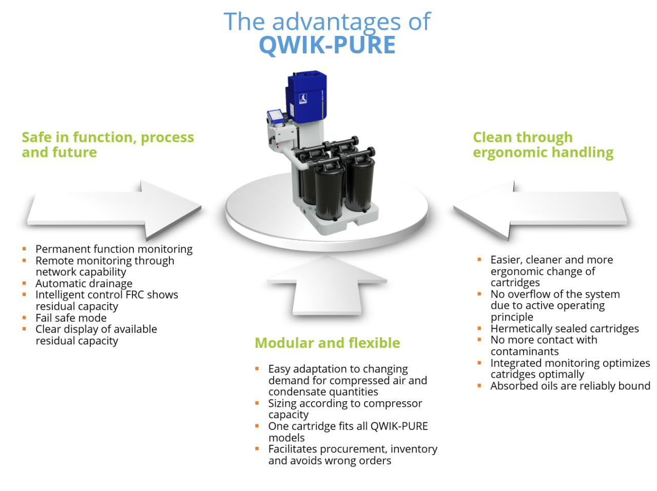 While conventional oil-water separators work on the gravity principle and the condensate seeps into the filter media, in the QWIK-PURE the condensate is actively forced through the pre-filter and main filter by a light stream of compressed air. The cartridge is permanently filled with liquid to prevent it from drying and forming an impereable boundary layer. Problematic cultures with which employees or service personell could come into contact are hardly ever present.