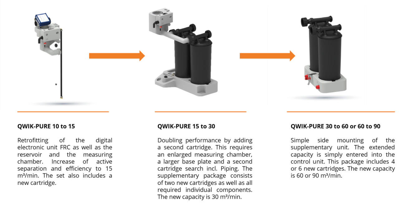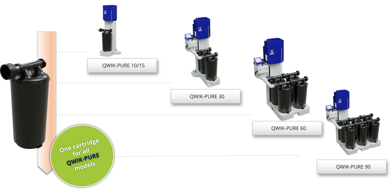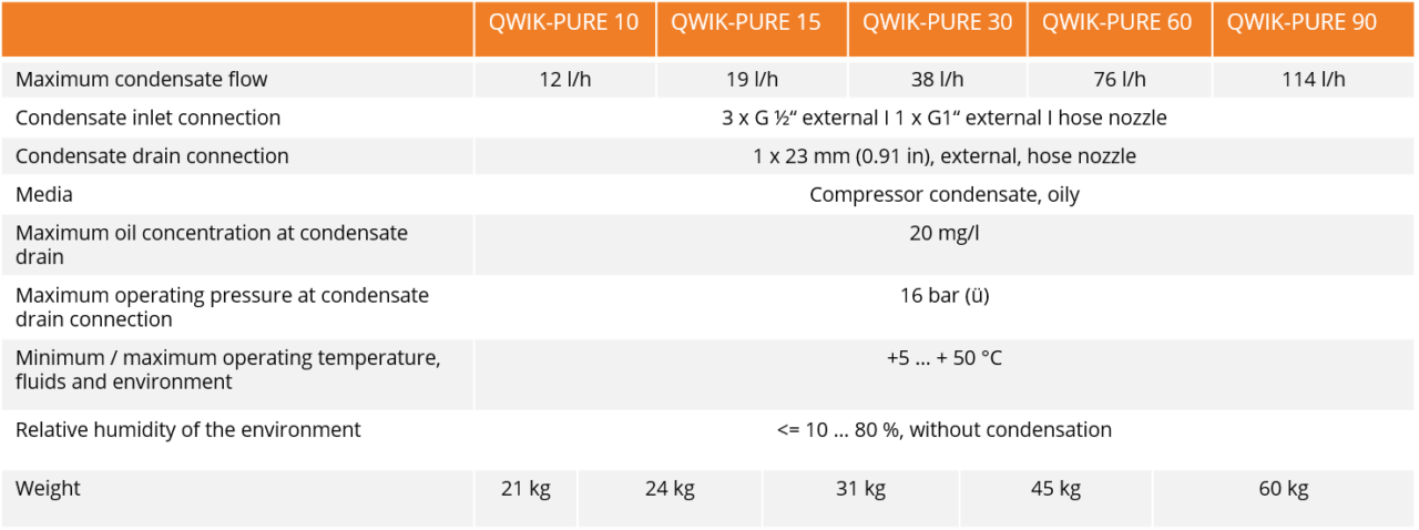 In such situations, the maintenance intervals are shortened slightly to ensure optimum functionality. However, there are clear limitations: In the event of an unexpectedly high volume of condensate, a smaller model such as the QWIK-PURE 15 could also be overwhelmed when a larger QWIK-PURE 90 is actually required.