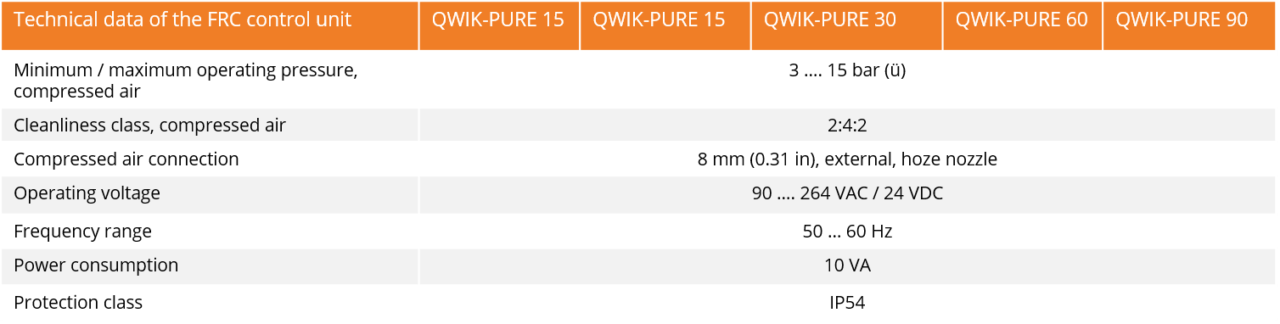 The energy consumption of the QWIK-PURE varies depending on various factors. In regular operation, during a draining process, the compressed air consumption of the device is only 3 to 7 liters per draining process. During servicing, the compressed air consumption is between 15 and 70 liters.