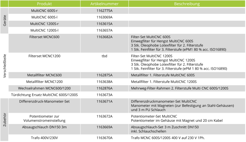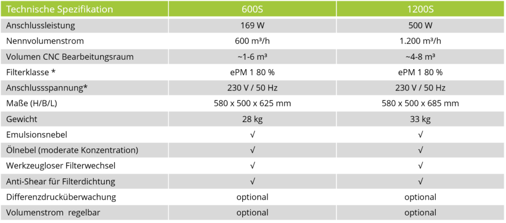 Der MultiCNC ist äußerst vielseitig einsetzbar und bewältigt ein breites Spektrum von Anwendungen. Bei normalen Kühlschmierstoffnebel-Konzentrationen und einer sachgemäßen Absaugung weist er sehr lange Filterstandzeiten auf. Selbst bei höheren Konzentrationen bleibt der MultiCNC zuverlässig in Betrieb, erfordert jedoch regelmäßigere Filterwechsel. Das Filterprinzip des MultiCNC zeigt besonders in Verbindung mit Emulsionen seine Stärken, kann jedoch auch bei leichteren Anwendungen mit Ölnebeln effektiv eingesetzt werden. Weitere Informationen zur zu erwartenden Konzentration von KSS-Nebeln finden sich im Anhang 1.3 der DGUV Regel 109-003.