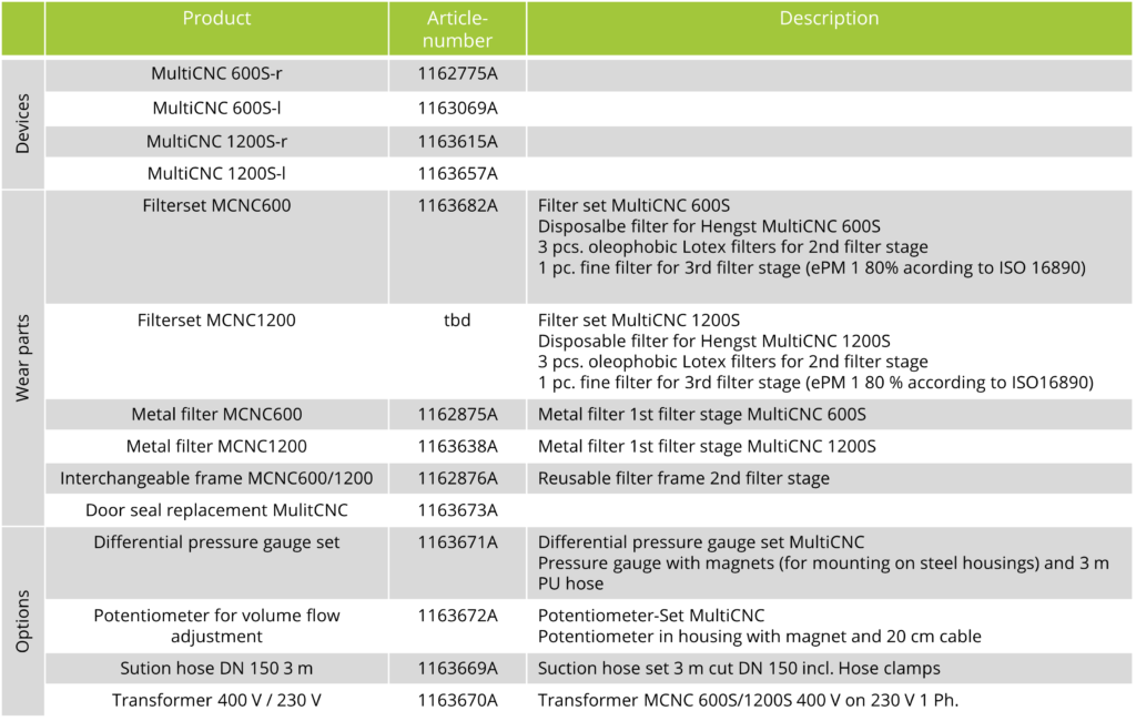 The connection diagram can be found on the product page. In general, the Hengst MultiCNC only requires a 230 VAC power supply with the appropriate power (170 W / 500 W). The unit can therefore simply be switched on at the beginning of the shift using the main switch provided and switched off again at the end of the shift. If required, it is possible to control the fan power via a potentiometer, a 0…10 V input or pulse width modulation (PWM).