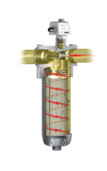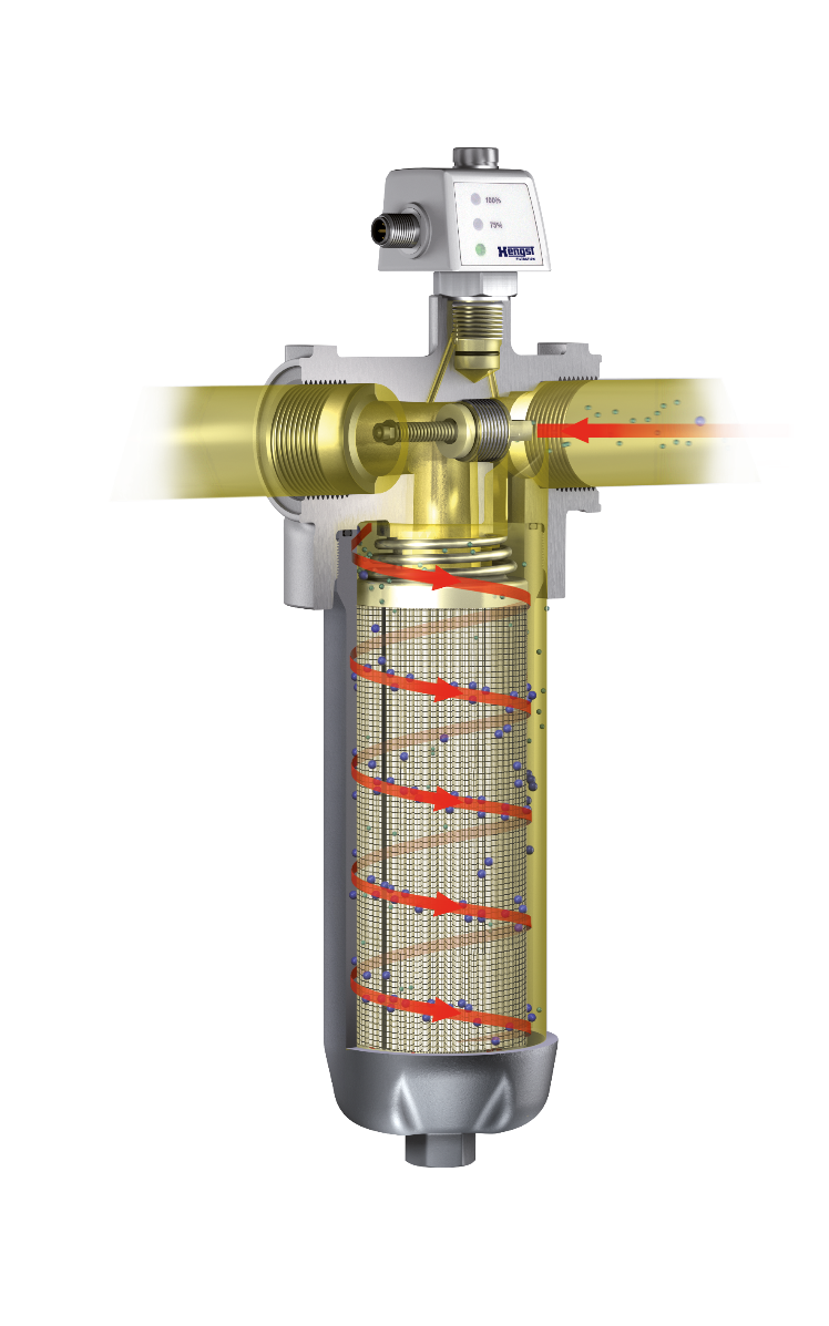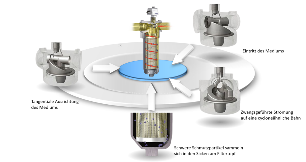 The cyclone effect means that the medium introduced no longer flows directly at the filter element. Instead, it flows in tangentially. The medium moves downwards around the filter element in a helical pattern. This so-called cyclone effect is patented and ensures that heavy dirt particles are transported downwards and the premature blocking of the filter element is prevented. Coarse dirt residues collect at the bottom of the filter bowl under the filter element – depending on the flow velocity.