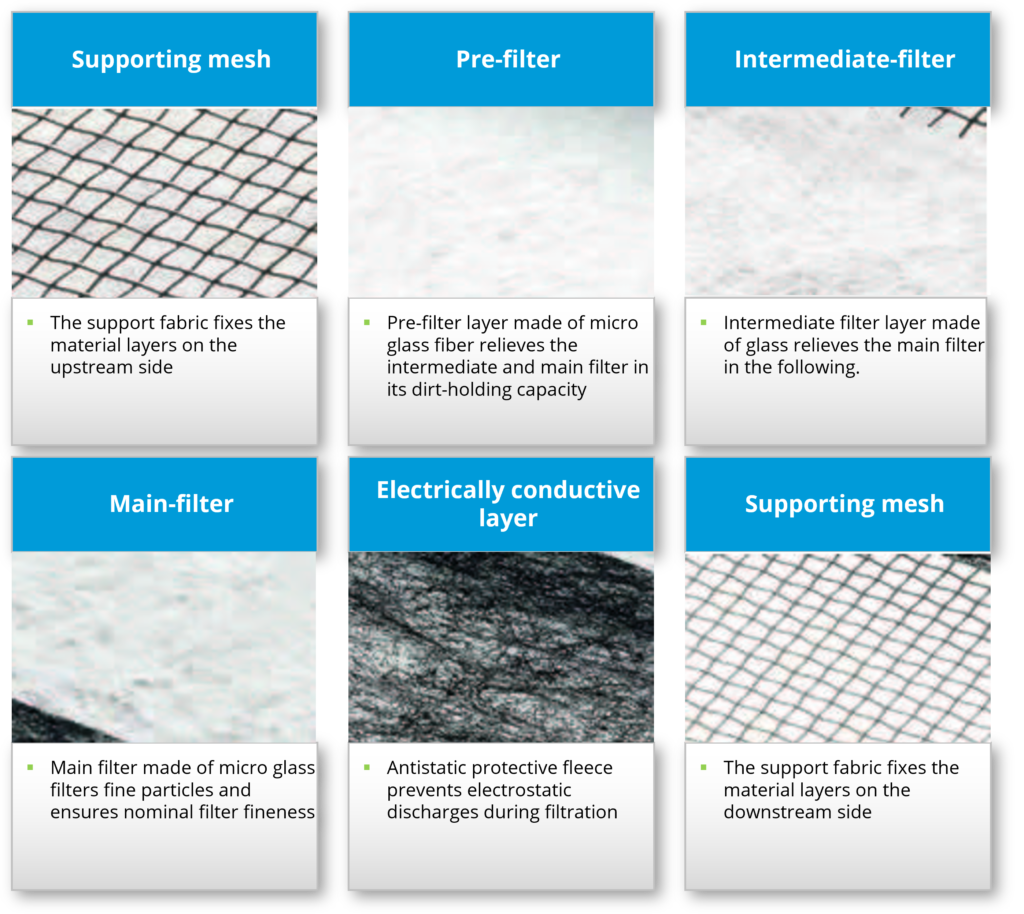 Assymmetrical inorganic paper layers made of glass fiber form the core of the filter elements – Generation 5 PURE POWER. Thanks to an innovative filter technology, the filter elements reliably retain dirt particles. Extremely high dirt-holding capacity combined with low pressure drop is guaranteed. Three effective micro glass fiber layers inside the element combined with electrically conductive fleece and support fabric are responsible for the increased performance. The pleated star is arranged in a cylindrical shape around the support tube. The element is sealed against liquids at the top and bottom by end plates. The longitudinal seam of the pleated star is also bonded in a liquid-tight manner.